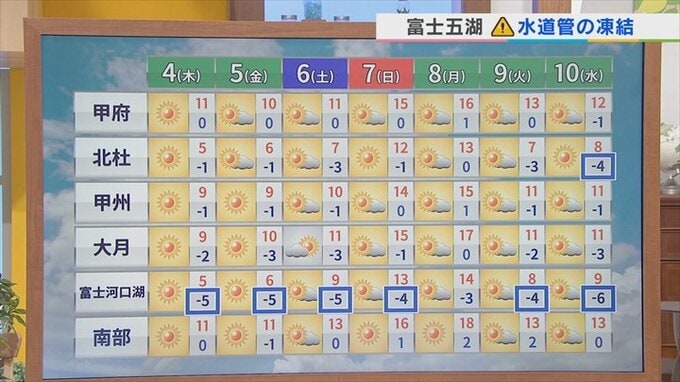 甲府でも最低気温0℃前後の日が続く見通しです。