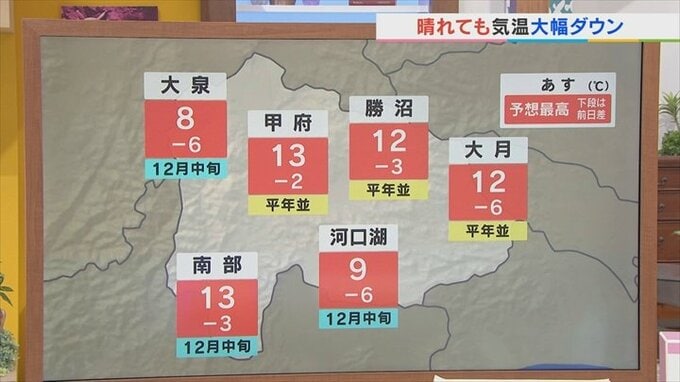最高気温を見ていきますと、特にきょうと比べて大幅に低くなるのが、北杜市大泉、大月、河口湖は6℃も低くなります。5℃違うと、服装1枚分変わると言われています。ですから服装1枚分それ以上の気温差となります。甲府や勝沼、南部もきょうと比べて2~3℃低い予想となっています。