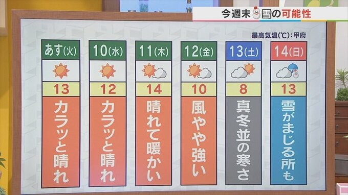 土曜日は寒さを運んできた後に上空の寒気もまた強まって真冬並みの寒さ。甲府は8℃予想で14日の日曜日は予報が変わる可能性がありますが山沿いでは雪が混じるところも出てくるかもしれません。