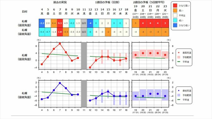 北海道地方の気温は、向こう2日間程度は寒気の影響で低いですが、その後は、寒気の影響を受けにくいため平年並か高く、12月18日頃からはかなり高くなる可能性があります。