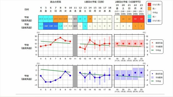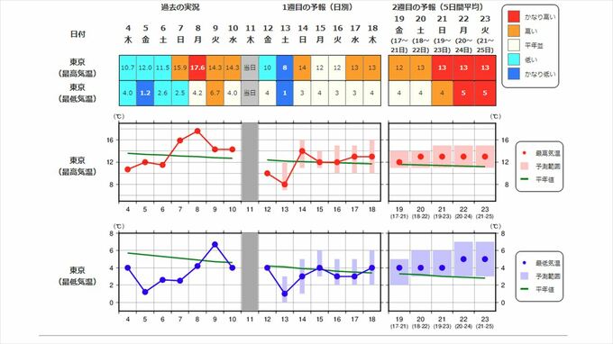 関東甲信地方の気温は、向こう2日間程度は寒気の影響で低いですが、その後は、寒気の影響を受けにくいため平年並か高く、19日頃からはかなり高くなる可能性があります。