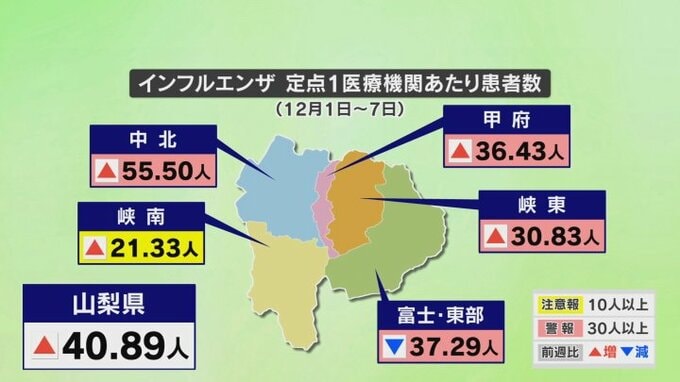 県感染症対策センターによりますと12月7日までの1週間、1医療機関あたりの感染者数は40.89人で前の週よりも増加しました。