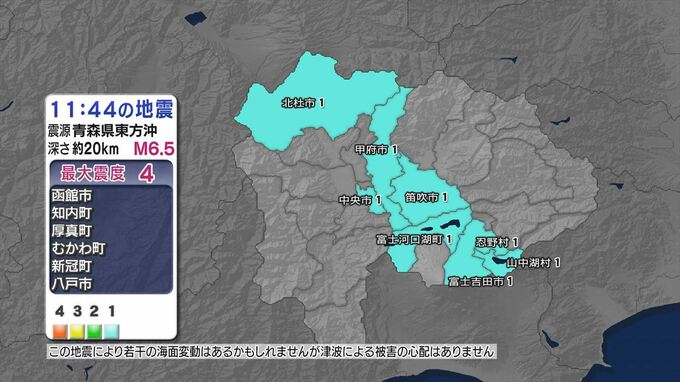 最大震度4を観測したのは、北海道の函館市、知内町、厚真町、むかわ町、それに新冠町、青森県の五所川原市、つがる市、平内町、今別町、外ヶ浜町、八戸市、十和田市、三沢市、野辺地町、七戸町、六戸町、横浜町、東北町、おいらせ町、三戸町、五戸町、田子町、青森南部町、階上町、むつ市、それに東通村、岩手県の盛岡市、二戸市、八幡平市、滝沢市、岩手町、矢巾町、軽米町、一戸町、奥州市、それに金ケ崎町、宮城県の登米市、秋田県の北秋田市です。