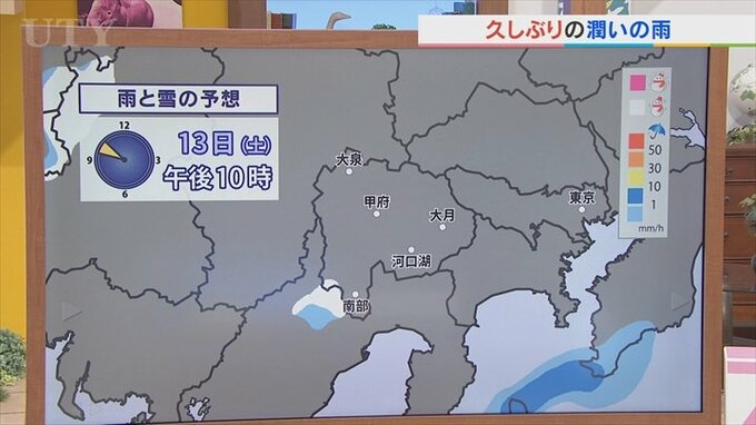 午後11時、そして日付変わって日曜日の午前0時ごろ、白色の部分が雪となりますが東部・富士五湖にかかってくる見通しで、一旦止み間はありますが、またあさって日曜日の明け方以降雨となりまして、断続的に雨の時間が長くなります。昼前になると雨の降り方が強まって土砂降りのところもある見通しですが、今のところ大雨まではいきませんので、各地で潤いの雨ということになりそうなんです。