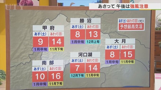 一番高いところで南部が10℃止まり。そして甲府9℃。勝沼、大月で8℃と1月の中旬並みの気温です。あすは風は穏やかとなります。