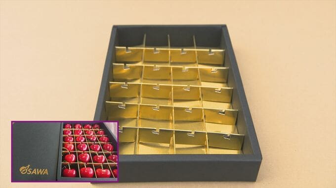 中は金色のダンボールを織り込み重ね、高級感があります。山梨の特産、サクランボを入れるためのダンボールです。