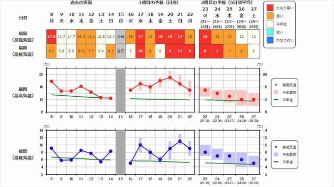九州北部地方(山口県を含む)の向こう2週間の気温は、寒気の影響が弱く、暖かい空気が流れ込む日もあるため高い日が多く、20日頃からはかなり高くなる見込みです。