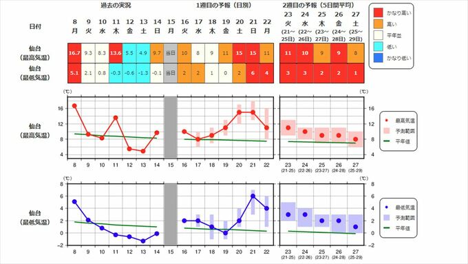 東北地方の向こう2週間の気温は、寒気の影響が弱く、暖かい空気が流れ込む日もあるため高い日が多く、20日頃からはかなり高くなる見込みです。