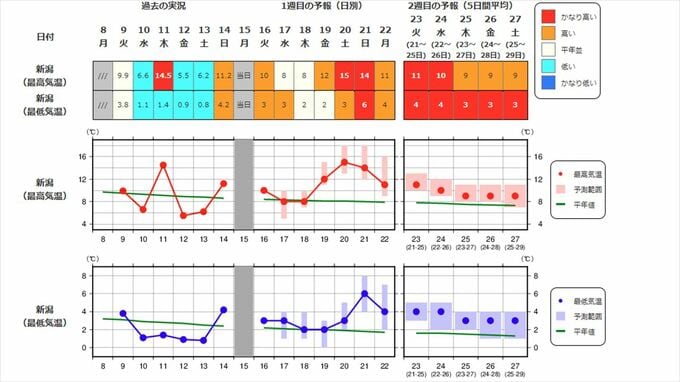 北陸地方の向こう2週間の気温は、寒気の影響が弱く、暖かい空気が流れ込む日もあるため高い日が多く、20日頃からはかなり高くなる見込みです。
