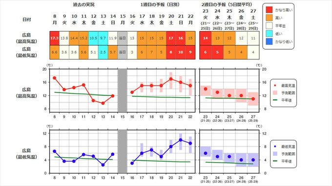 中国地方の向こう2週間の気温は、寒気の影響が弱く、暖かい空気が流れ込む日もあるため高い日が多く、20日頃からはかなり高くなる見込みです。