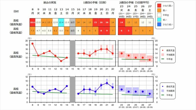 四国地方の向こう2週間の気温は、寒気の影響が弱く、暖かい空気が流れ込む日もあるため高い日が多く、20日頃からはかなり高くなる見込みです。