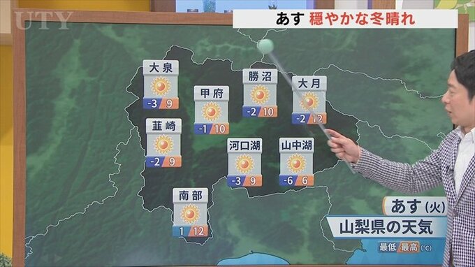 16日は穏やかな冬晴れの天気で洗濯外干しにはおススメの一日に 米津龍一気象予報士が解説 山梨 2025年12月15日(月) 18:54 国内 天気 米津龍一気象予報士:あすのお天気ポイントはこちらです。穏やかな冬晴れとなりそうです。