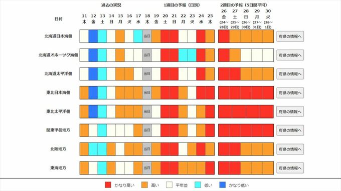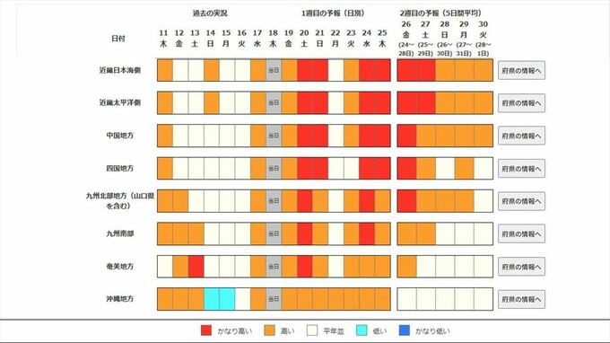 早期天候情報は、その時期としては10年に1度程度しか起きないような著しい高温や低温、降雪量(冬季の日本海側)となる可能性が、いつもより高まっているときに、6日前までに注意を呼びかける情報です。