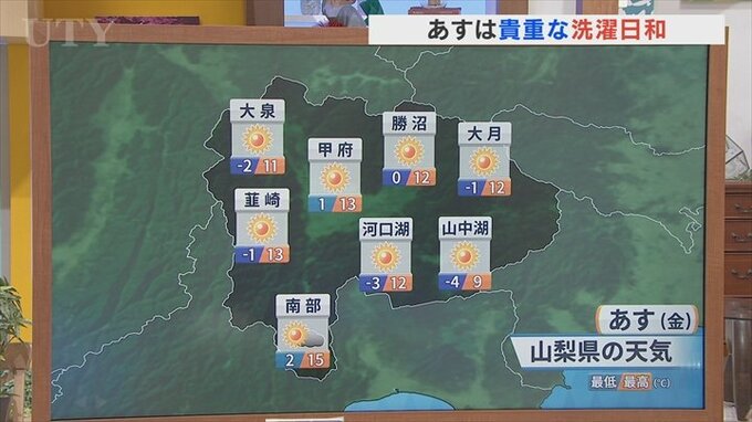 きょうと比べて5℃ほど低くなります。北杜市大泉も2℃低い-2℃予想です。