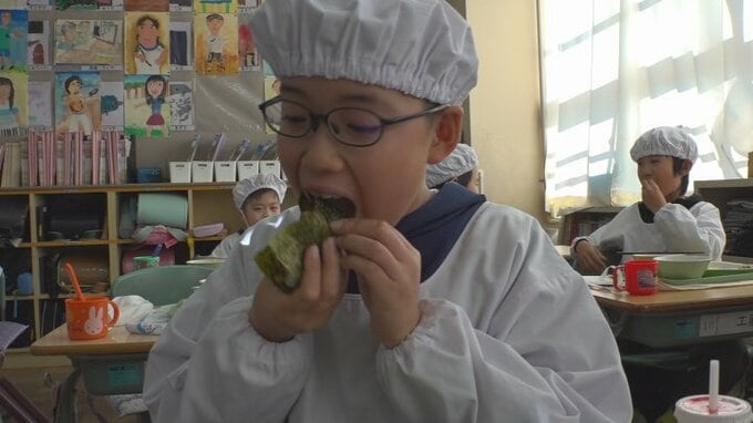 このうち舞鶴小学校の3年生の教室では児童たちがご飯と焼肉、具材を海苔に包んで次々とほおばっていました。