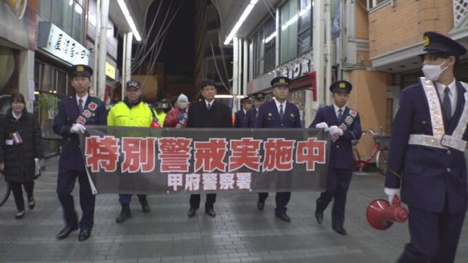 「年末年始は犯罪や火災が増える傾向」防犯意識向上へ 中心街で戸締りの徹底や火災予防など呼びかけるパトロール 山梨・甲府市 To view this video please enable JavaScript, and consider upgrading to a web browser that supports HTML5 video 2025年12月22日(月) 11:53 国内 甲府市の中心街で防犯や火災への注意を呼びかける合同パトロールが行われました。 合同パトロールは、年末に向けて防犯意識をより一層高めてもらおうと今月19日に行われたもので、甲府市の樋口市長や警察、消防などからおよそ50人が参加しました。