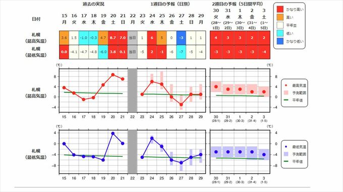 北海道地方の向こう3日間程度は寒気の影響が弱いため高い日が多く、かなり高い日もありますが、12月26日からの3日間程度は平年並か低いでしょう。その後は寒気の影響が弱まるため、かなり高くなる見込みです。
