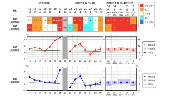 東北地方の向こう3日間程度は寒気の影響が弱いため高い日が多く、かなり高い日もありますが、12月26日からの3日間程度は平年並か低いでしょう。その後は寒気の影響が弱まるため、かなり高くなる見込みです。