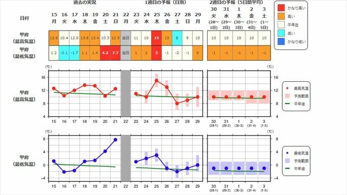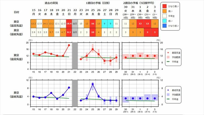 関東甲信地方の向こう4日間程度は寒気の影響が弱いため高い日が多く、かなり高い日もありますが、12月27日からの2日間程度は平年並か低いでしょう。その後は寒気の影響が弱まるため、かなり高くなる可能性があります。
