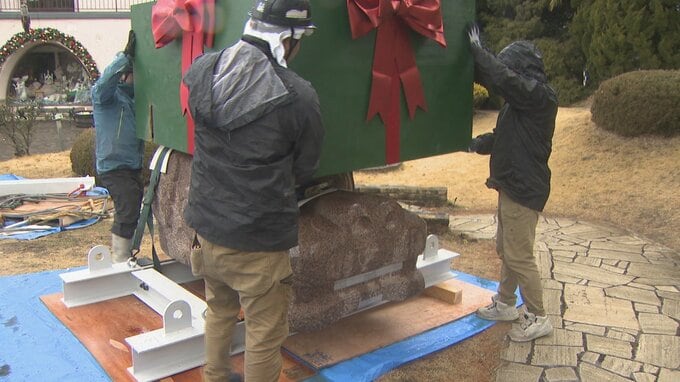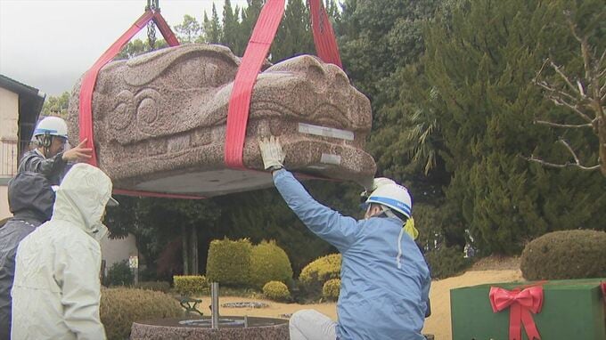 黄金のサイの次は赤いシシ 空から届いたプレゼントは赤御影石の「波除獅子」 山梨・河口湖音楽と森の美術館 2025年12月24日(水) 19:20 国内 香川県の美術館から河口湖 音楽と森の美術館に届けられたのは彫刻家、流政之の作品、「波除獅子」です。 東京築地の波除神社の獅子頭をモチーフにした赤御影石でできた彫刻で、重さは約4t。