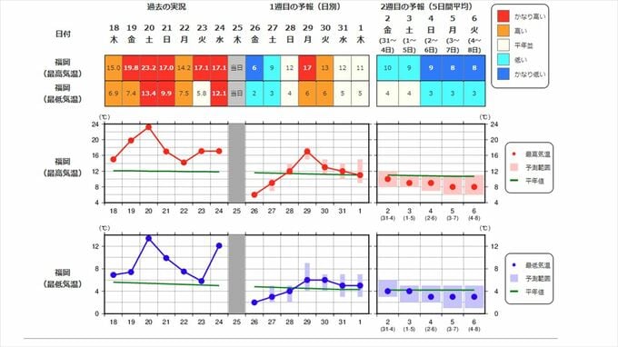 九州北部地方(山口県を含む)の向こう2週間の気温は、12月27日頃までは寒気の影響で低く、かなり低い日もあるでしょう。その後は暖かい空気に覆われやすいため平年並か高いですが、1月2日頃からは冬型の気圧配置が強まり、強い寒気の影響を受けやすいため、かなり低くなる可能性があります。