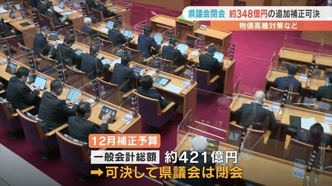 12月の補正予算案は一般会計の総額でおよそ421億円となり県議会は16日に可決して閉会しました。