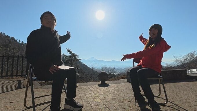 「きょうは かほさんにインタビューにこたえていただけるということで場所を屋外に設定したんですけれども、非常に天気に恵まれまして」