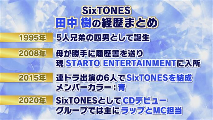 「こちら1995年に5人兄弟の四男として誕生されて、2008年にお母様が履歴書を送って、現STARTO ENTERTAINMENTに入所されます。2015年に連ドラ主演の6人でSixTONESを結成。メンバーカラーは青なんですね?」