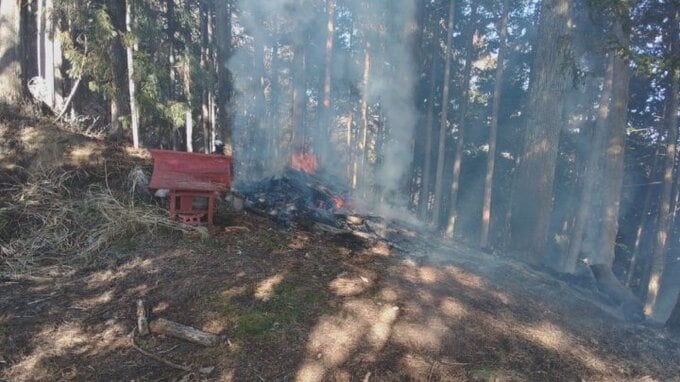 「燃えた切り株がどんどん転がって落ちてきて」山林火災 見えてきた延焼の原因 発生直後に消防団員が撮影した写真を入手 山梨・上野原市 2026年1月9日(金) 17:47 国内 大規模な山林火災、何が原因だったのでしょうか? 山林火災の発生直後に地元の消防団員が撮影した写真 これは山林火災の発生直後に地元の消防団員が撮影した写真です。 場所は扇山の登山道付近。 廃材が燃えています。