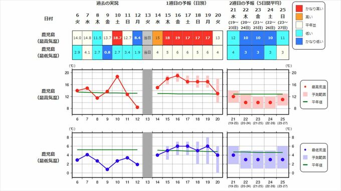 九州南部・奄美地方の気温は、向こう1週間程度は寒気の影響を受けにくいため高い日が多いですが、その後は冬型の気圧配置が強まる時期があり、寒気の影響を受けやすいため低い日が多く、21日頃からはかなり低くなる可能性があります。