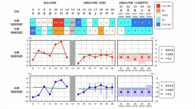 北海道地方の気温は、向こう1週間程度は平年並の日が多いですが、その後は冬型の気圧配置が強まる時期があり、寒気の影響を受けやすいため低く、21日頃からはかなり低くなる可能性があります。また、21日頃からは北海道日本海側を中心に降雪量がかなり多くなる可能性があります。