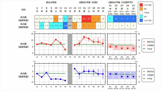 東海地方の気温は、向こう1週間程度は寒気の影響を受けにくいため平年並か高いですが、その後は冬型の気圧配置が強まる時期があり、寒気の影響を受けやすいため低い日が多く、21日頃からはかなり低くなる可能性があります。また、21日頃からは岐阜県山間部を中心に降雪量がかなり多くなる可能性があります。