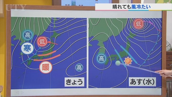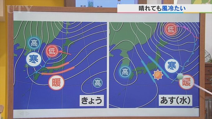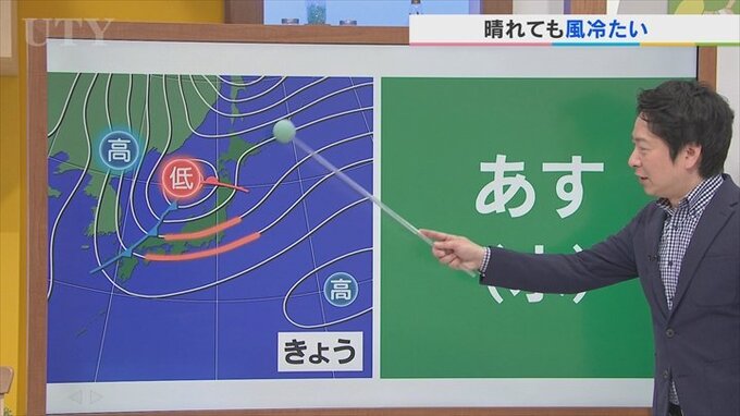 高気圧は時計回りに風が吹きますから北から乾いた空気が流れ込んでくるので晴れますが、今度は北風に変わります。つまり冷たい風です。さらにこの前線も東の方へと離れていきますから山梨県内はこの冷たい空気=寒気のゾーンに入ってきますので、あすは晴れても気温が上がらないことになります。