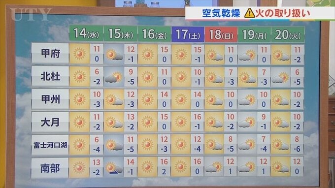 この先晴れの日が続きますが、気温がこの金曜日、土曜日、甲府の最高気温は15℃まで上がる予想です。春の暖かさということになります。