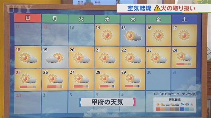 この先雨があるかどうか、甲府の16日間先の予報を見ていきますと、残念ながら少なくとも29日まで晴れの日が続く予想です。晴れの日というのは空気が乾燥すること、さらに風も強まりますとより火の取り扱いが要注意となります。そして感染症も油断できない状況となりますので、晴れだからと言って良いことばかりではありませんから、火の取り扱いや感染症にくれぐれもお気をつけください。