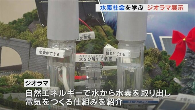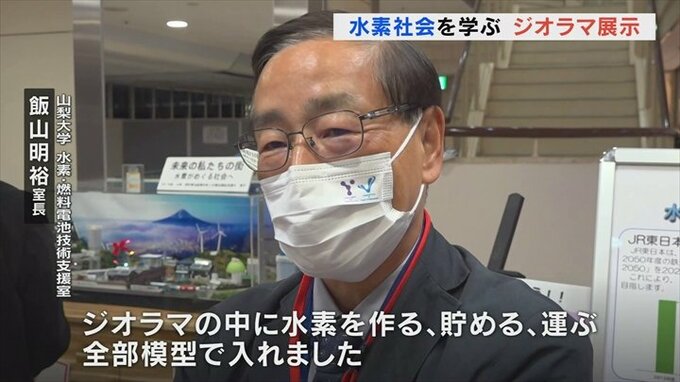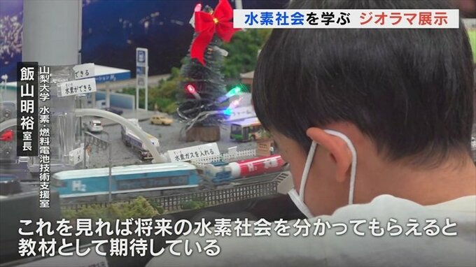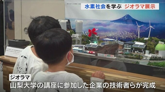 ジオラマは山梨大学の講座に参加した企業の技術者らが完成させたもので、実際に鉄道模型やイルミネーションには水素で作られた電気が使われています。