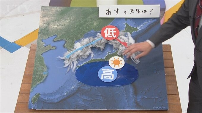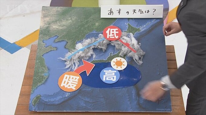 あすの気圧配置が南に高気圧、北に低気圧の南高北低と気象的には言いますが、気圧は高いところから低いところへと風が流れていきますので、この気圧配置だと