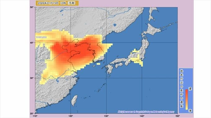 【黄砂情報】黄砂が飛来か 九州、中国、四国、近畿、東海、北陸、関東周辺は16日から予測図に黄色い帯 【黄砂のシミュレーション】 2026年1月15日(木) 10:50 国内 天気 気象庁によりますと15日から日本列島に黄砂が飛んでくる見込みです。 気象庁のHPより 気象庁のホームページに掲載されている黄砂解析予想図によりますと15日の12時には黄砂は東海地方などにかかっています。