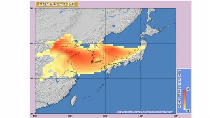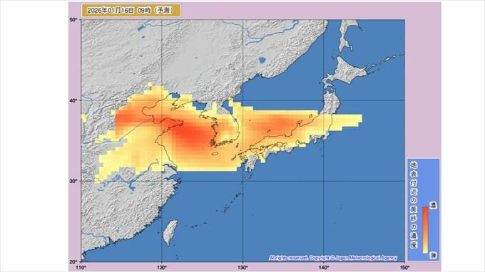 【黄砂情報】黄砂が飛来か 九州、中国、四国、近畿、東海、北陸、関東周辺は16日から予測図に黄色い帯 【黄砂のシミュレーション】 2026年1月15日(木) 10:50 国内 天気 そして16日9時には関東にもかかってきています。