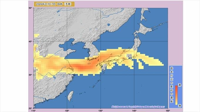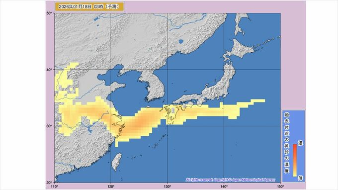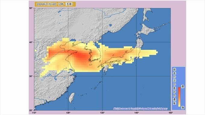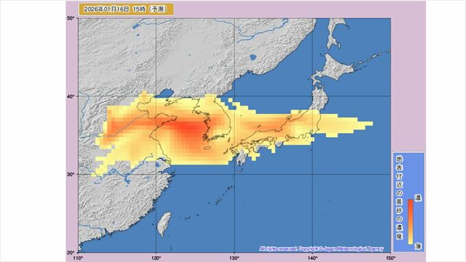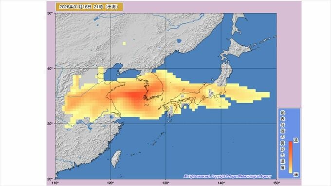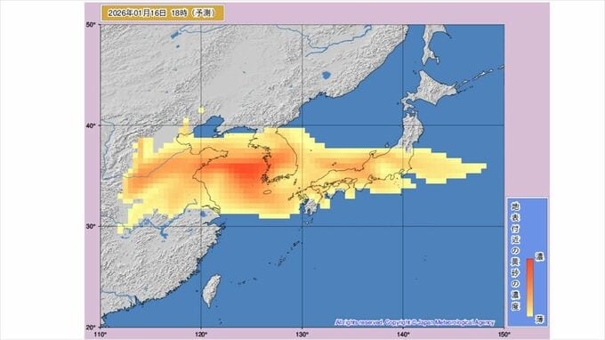【黄砂情報】黄砂が飛来か 九州、中国、四国、近畿、東海、北陸、関東周辺は16日から予測図に黄色い帯 【黄砂のシミュレーション】 2026年1月15日(木) 10:50 国内 天気 16日18時には九州北部から中国地方、四国、近畿、東海、北陸、関東周辺のほとんどが黄砂予測の黄色に覆われ、一部は色が濃くなって表示されています。 その後、18時03時には本州からほぼ離れる予想ですが、四国や九州に残っています。