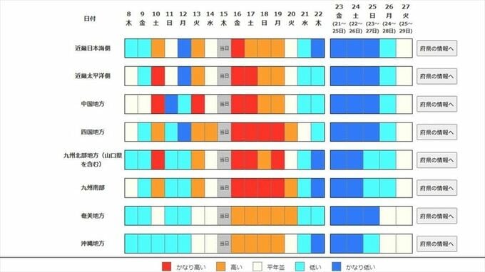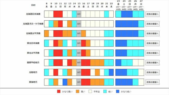 早期天候情報は、その時期としては10年に1度程度しか起きないような著しい高温や低温、降雪量(冬季の日本海側)となる可能性が、いつもより高まっているときに、6日前までに注意を呼びかける情報です。