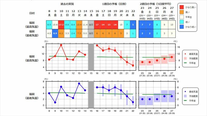 九州北部地方(山口県を含む)の気温は、向こう4日間程度は寒気の影響を受けにくいためかなり高い日が多いですが、その後は冬型の気圧配置が強まり、寒気の影響を受けやすくなるため低い日が多く、21日頃からはかなり低くなる見込みです。気温の変動が大きいでしょう。
