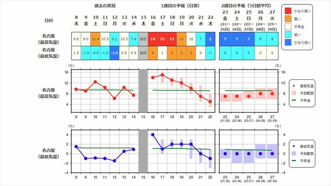 東海地方の気温は、向こう5日間程度は寒気の影響を受けにくいため高く、17日頃まではかなり高いですが、その後は冬型の気圧配置が強まる時期があり、寒気の影響を受けやすいため低い日が多く、21日頃からはかなり低くなる見込みです。気温の変動が大きいでしょう。