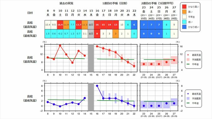 四国地方の気温は、向こう5日間程度は寒気の影響を受けにくいためかなり高い日が多いですが、その後は冬型の気圧配置が強まる時期があり、寒気の影響を受けやすいため低い日が多く、21日頃からはかなり低くなる見込みです。気温の変動が大きいでしょう。