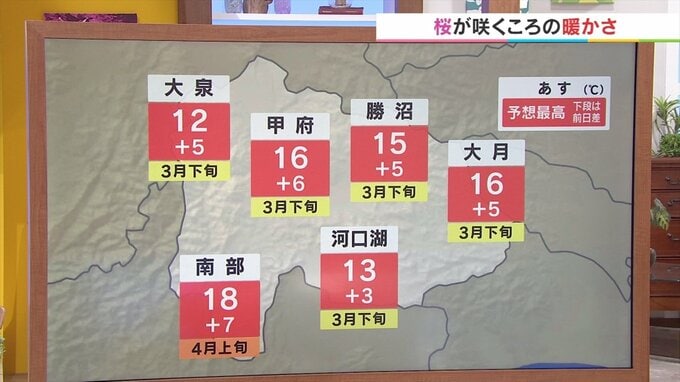 今日と比べて甲府は6℃も高い16℃予想。3月下旬並みの気温。