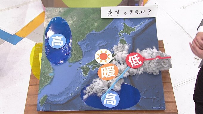 前線が南下するんですけども、この暖かい空気が明日、残ったままとなりまして、これによって春のような暖かさとなります。