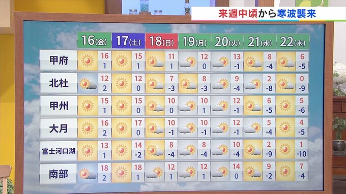 しばらく寒気が居座って、寒波となりそうなんですねですので、甲府も連日、最低気温がマイナス4℃を下回ってきますので、水道管の凍結、要注意ということになりそう。