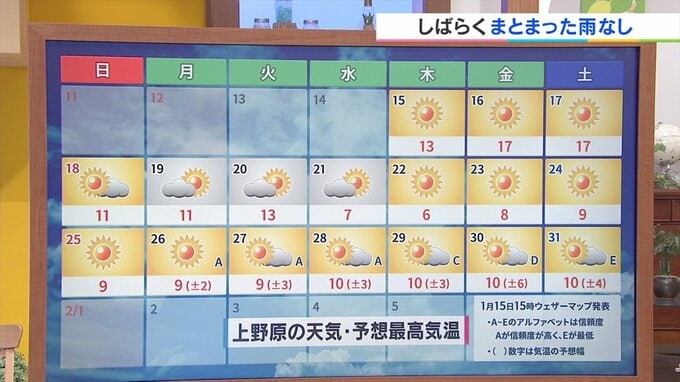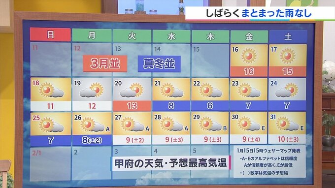 そろそろ恵みの雨欲しいところなんですが、甲府の16日間先の予報を見ていきますと、もう ずっと晴れの日が続く見通しとなっています。