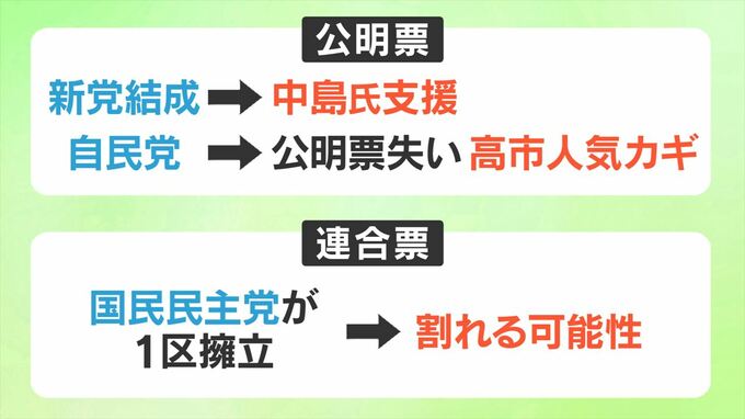 最も注目されるのは公明票の行方で、新党の結成により中道改革連合から立候補予定の中島さんに流れるとみられます。