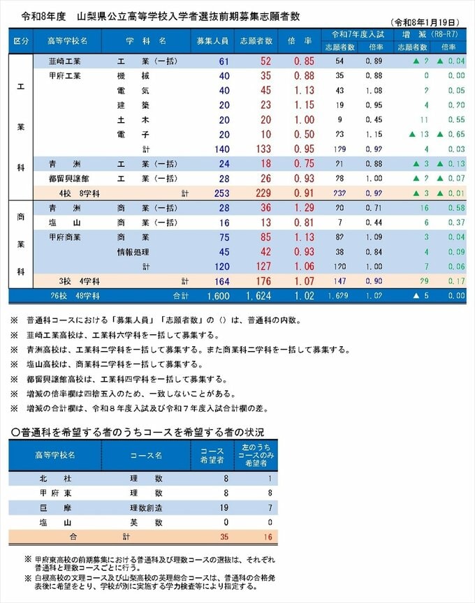 公立高校入試 前期試験の倍率発表 全体倍率は過去2番目に低い1.02倍 山梨
